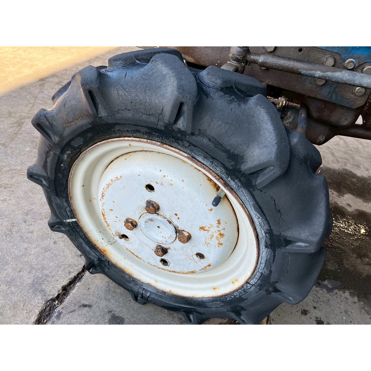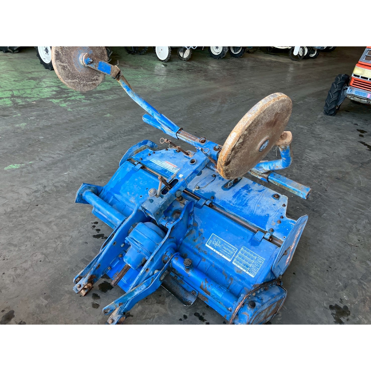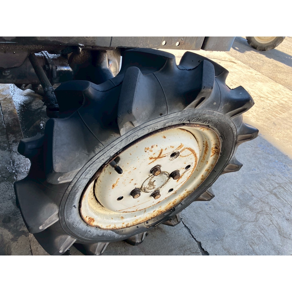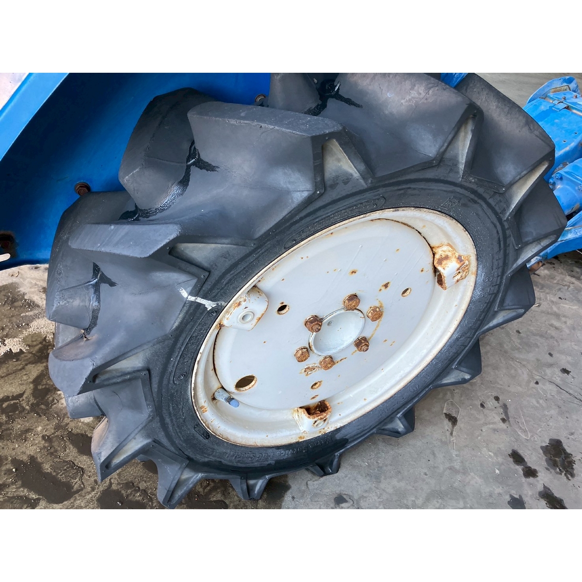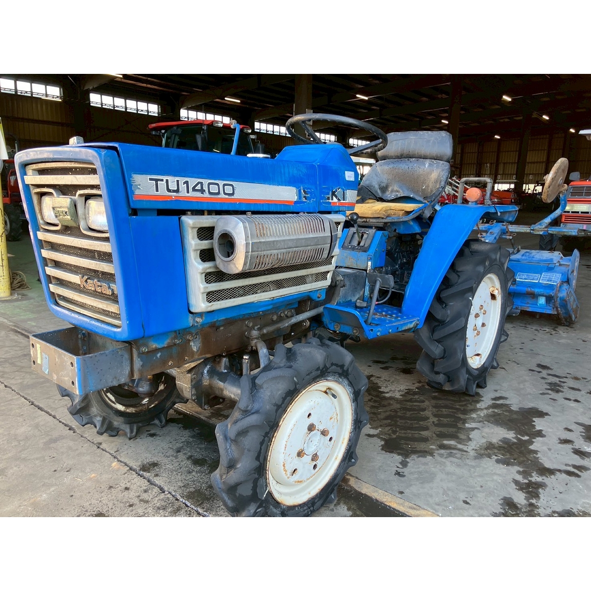 - with rotary, no battery, without PS, cracked front left tire and rear tires, no problem in operation, faded exterior, tractor has rust, torn seat