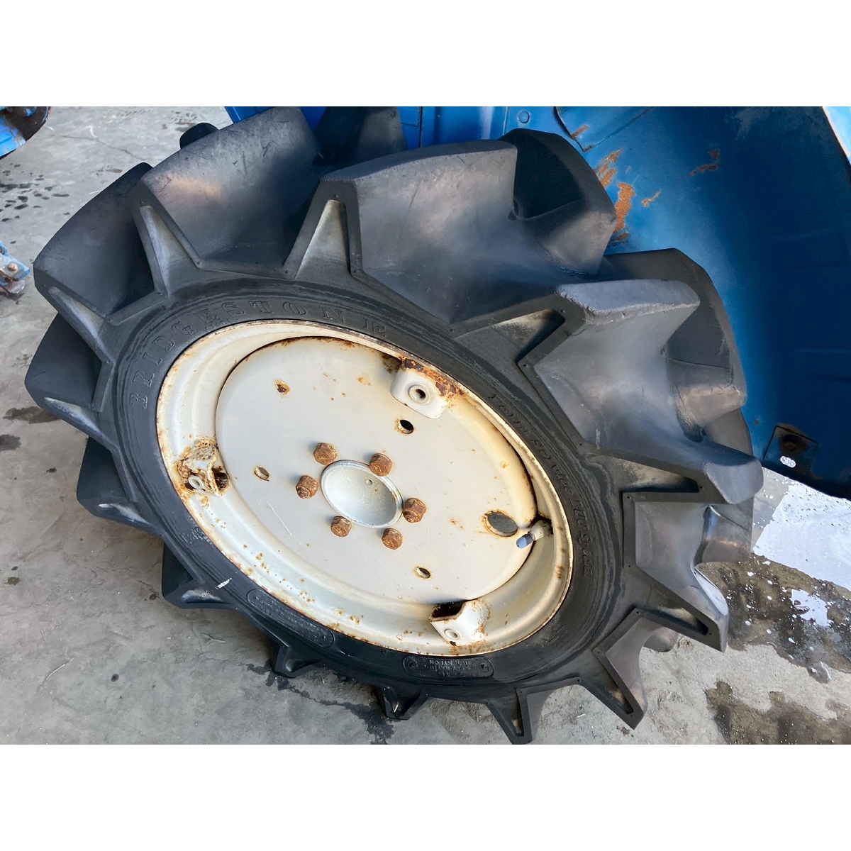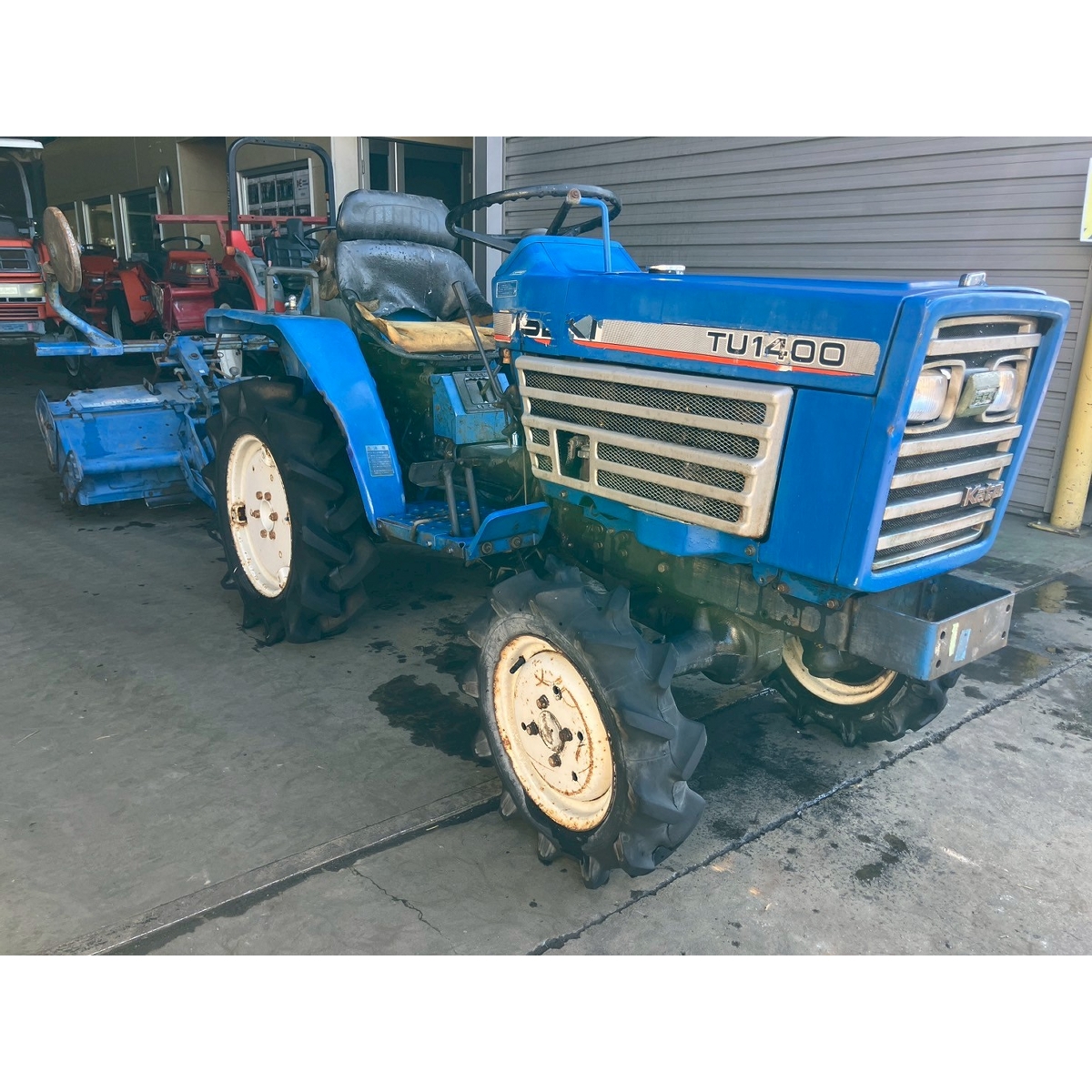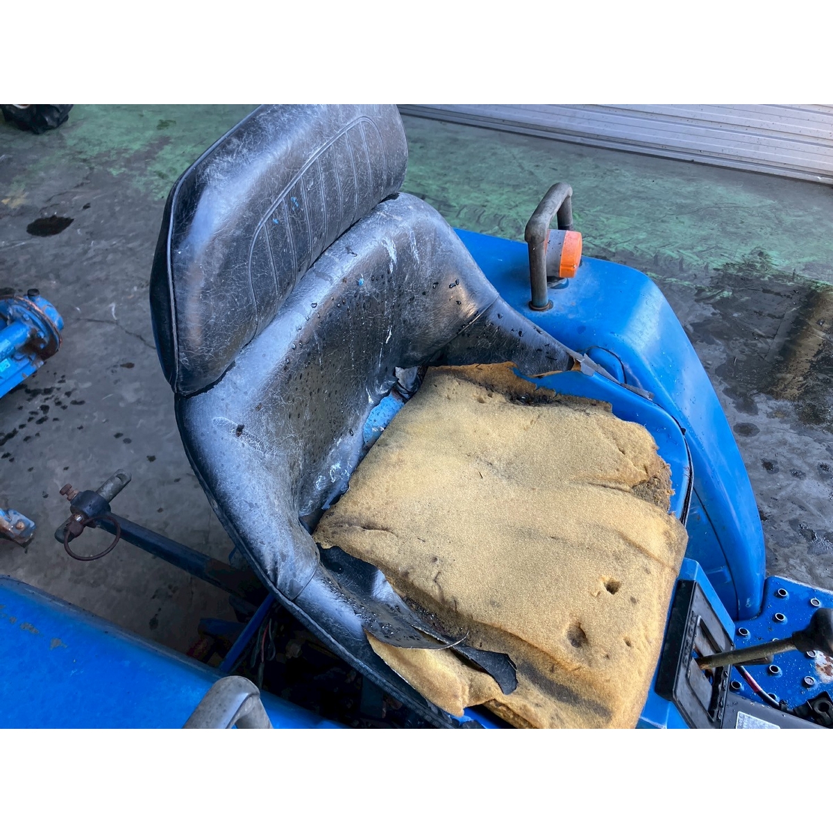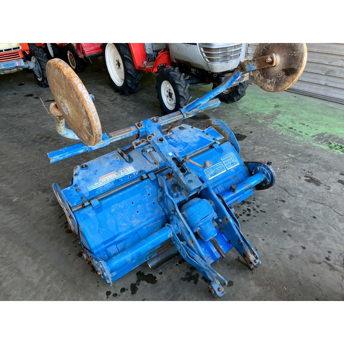 - with rotary, no battery, without PS, cracked front left tire and rear tires, no problem in operation, faded exterior, tractor has rust, torn seat
