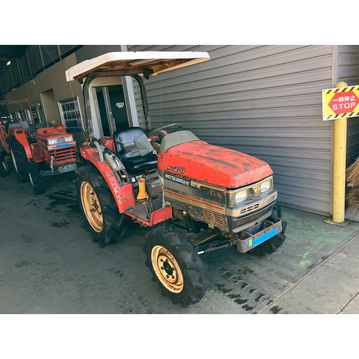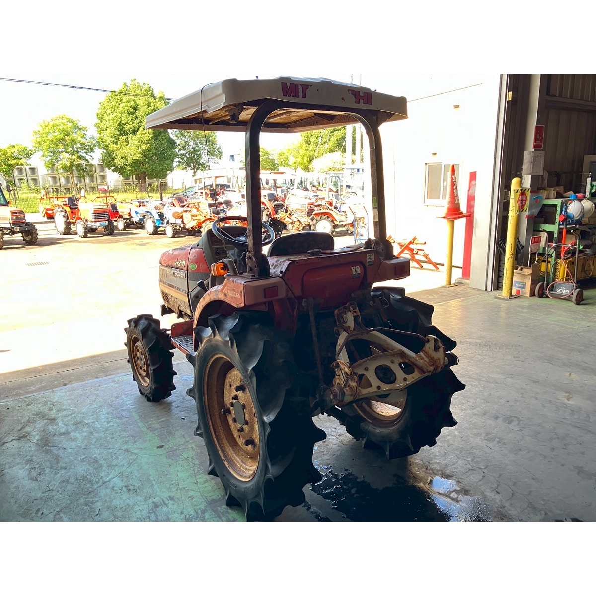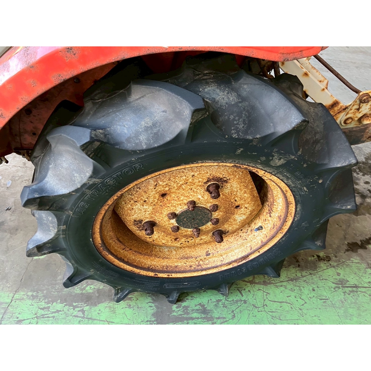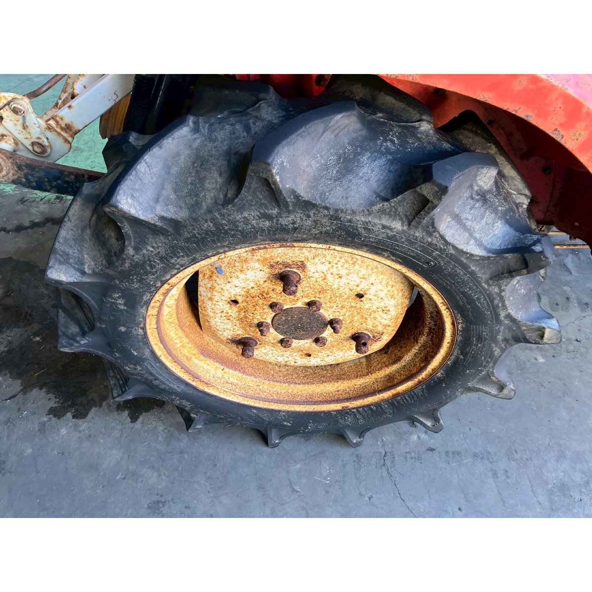 - without rotary, battery ok, with PS, cracked and worn rear tires, wobbling the tractor for a moment when tractor is driving at high speed, faded and rusty exterior, radiator has run out of coolant, sightly oil leak from around front tires' shaft, loosen fan belt, water leaking, deteriorated exterior because of rust, with canopy