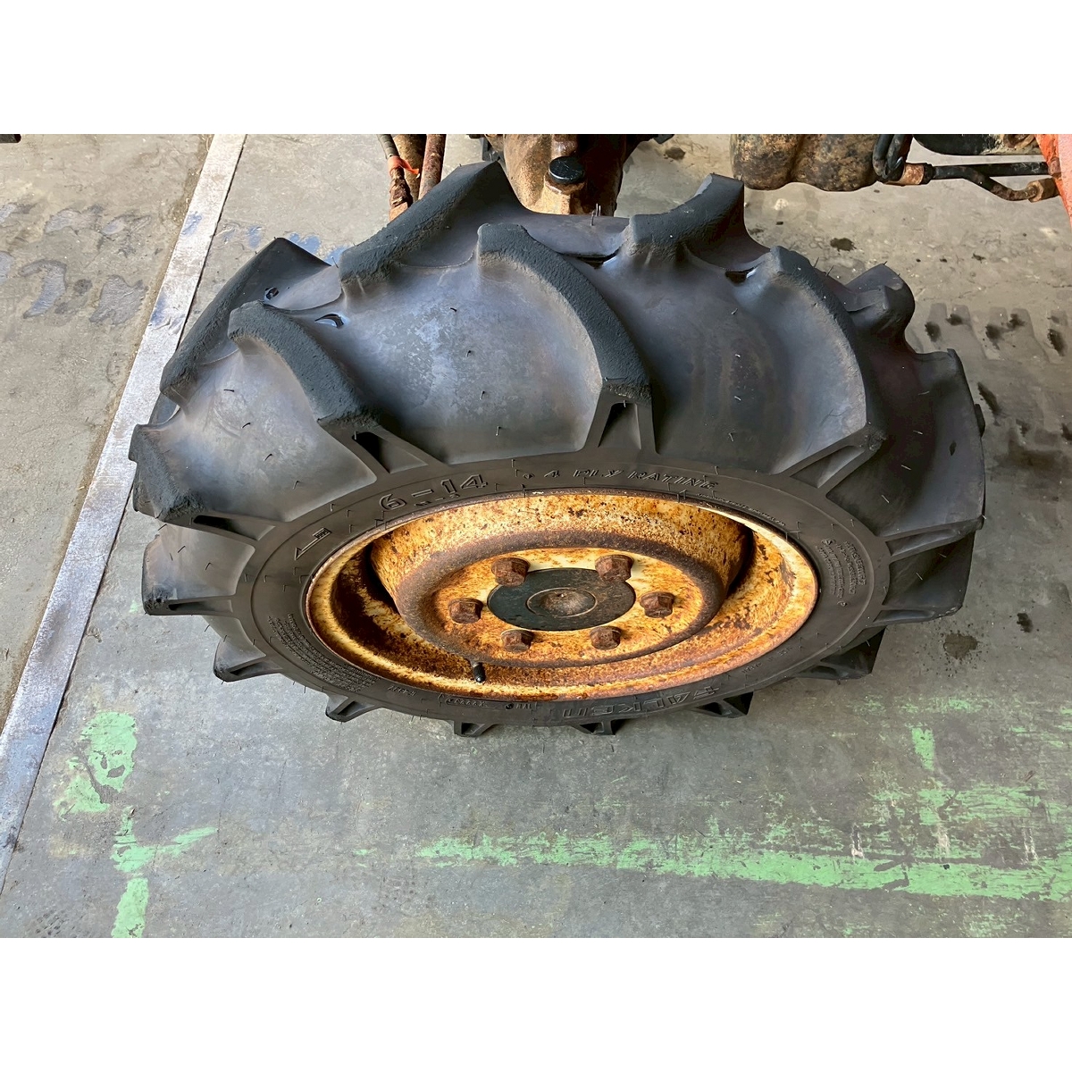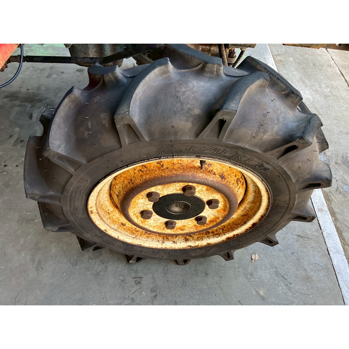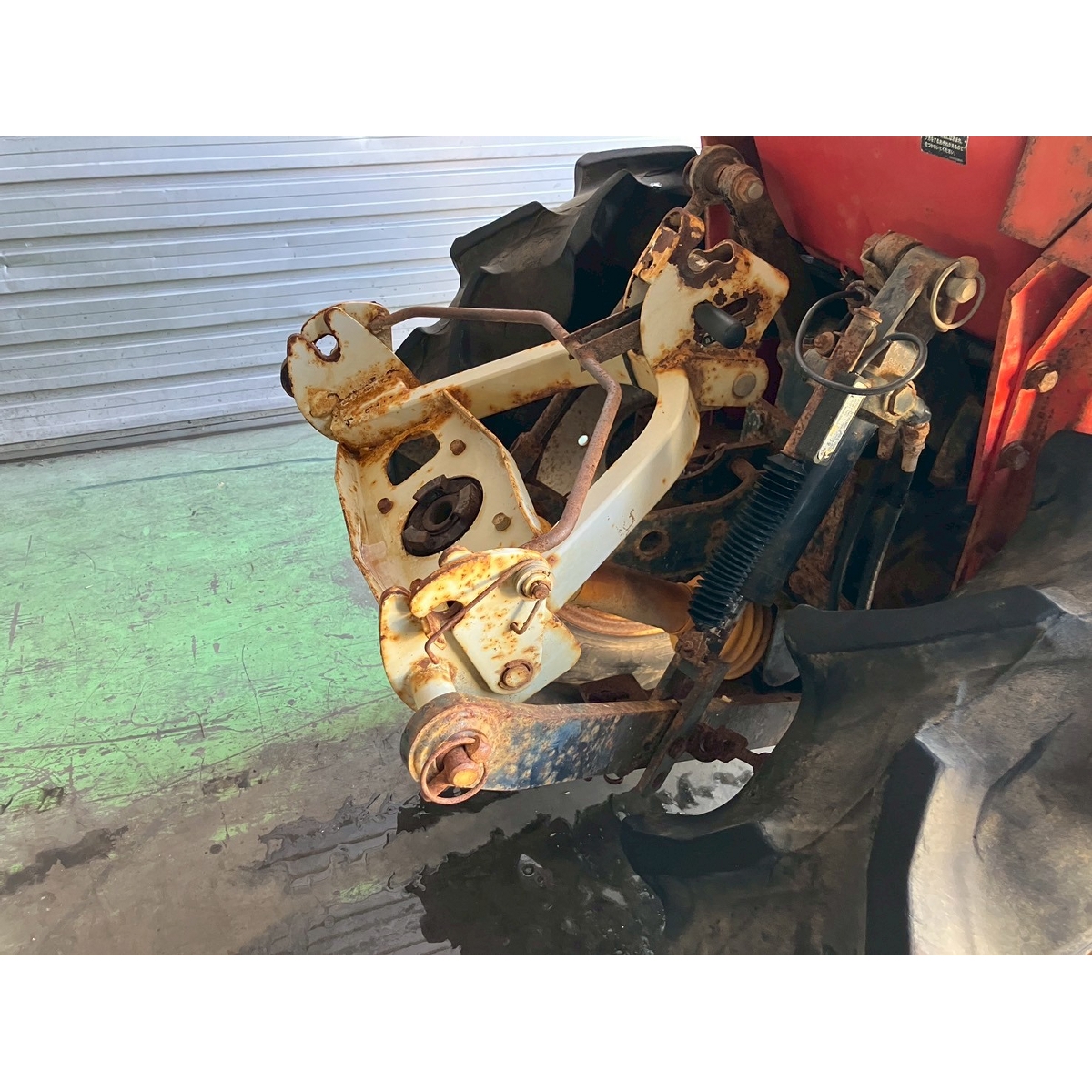 - without rotary, battery ok, with PS, cracked and worn rear tires, wobbling the tractor for a moment when tractor is driving at high speed, faded and rusty exterior, radiator has run out of coolant, sightly oil leak from around front tires' shaft, loosen fan belt, water leaking, deteriorated exterior because of rust, with canopy