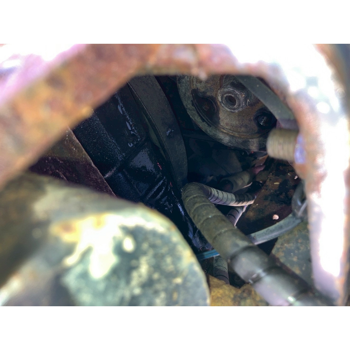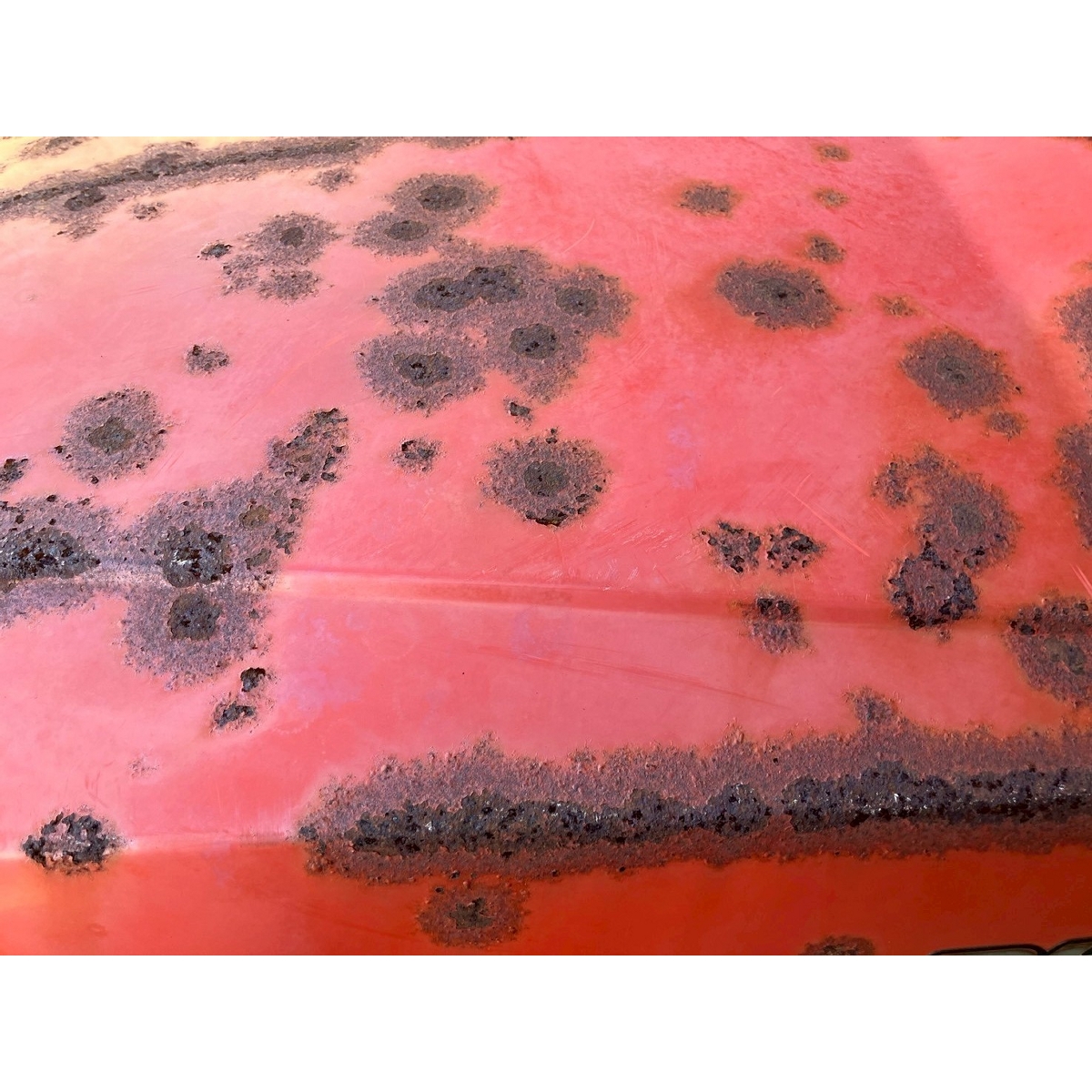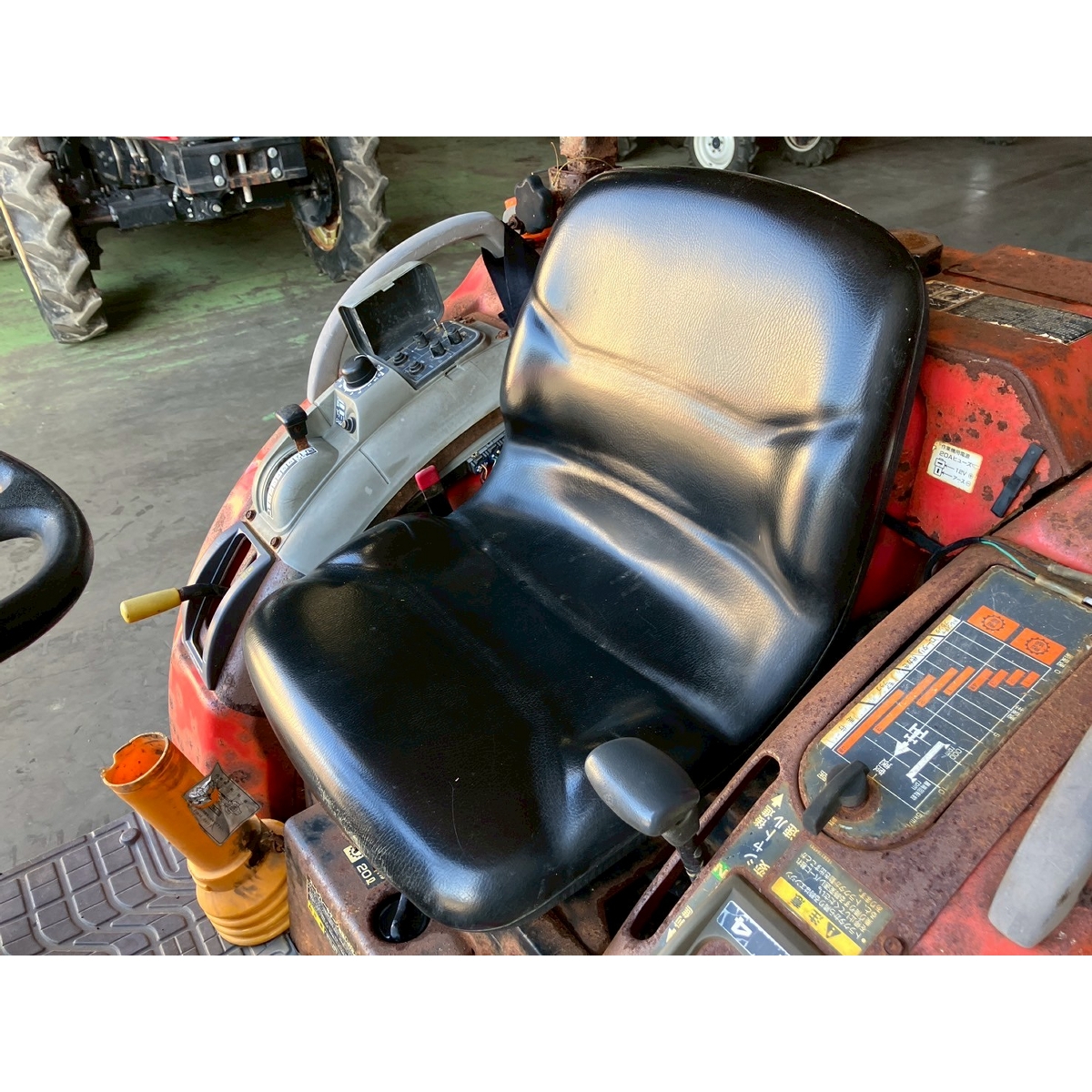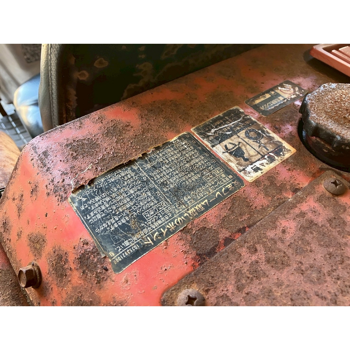 - without rotary, battery ok, with PS, cracked and worn rear tires, wobbling the tractor for a moment when tractor is driving at high speed, faded and rusty exterior, radiator has run out of coolant, sightly oil leak from around front tires' shaft, loosen fan belt, water leaking, deteriorated exterior because of rust, with canopy