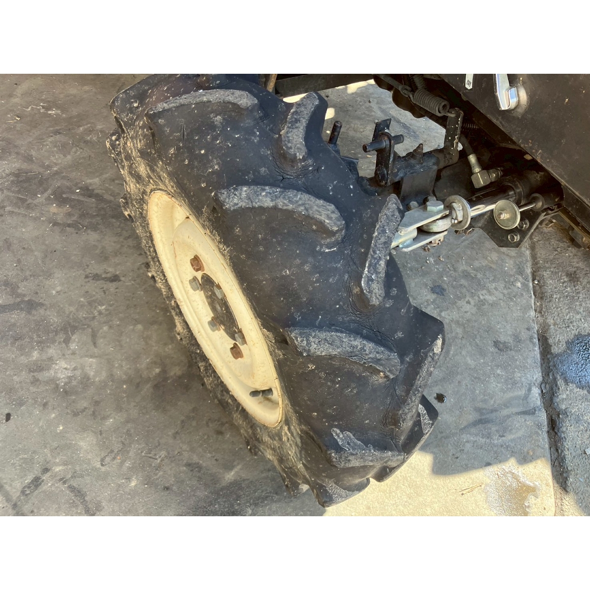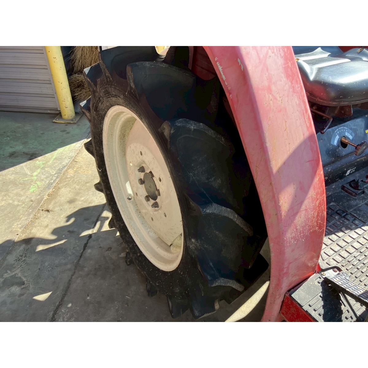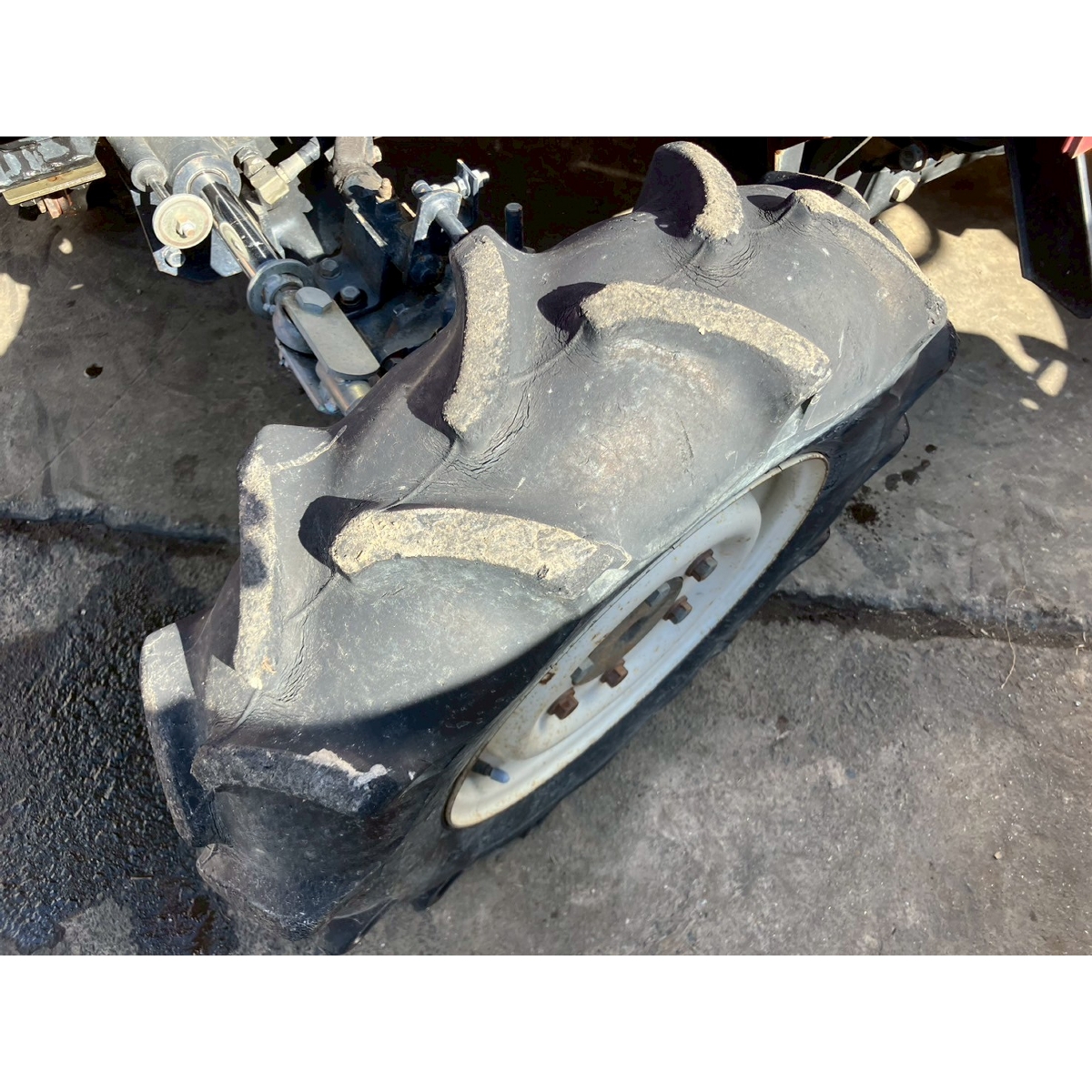 - without rotary, battery ok, with PS, cracked all tires, slightly oil leak from front left tire's shaft, white smoke comes out when engine is running, faded exterior, tractor has rust, torn seat