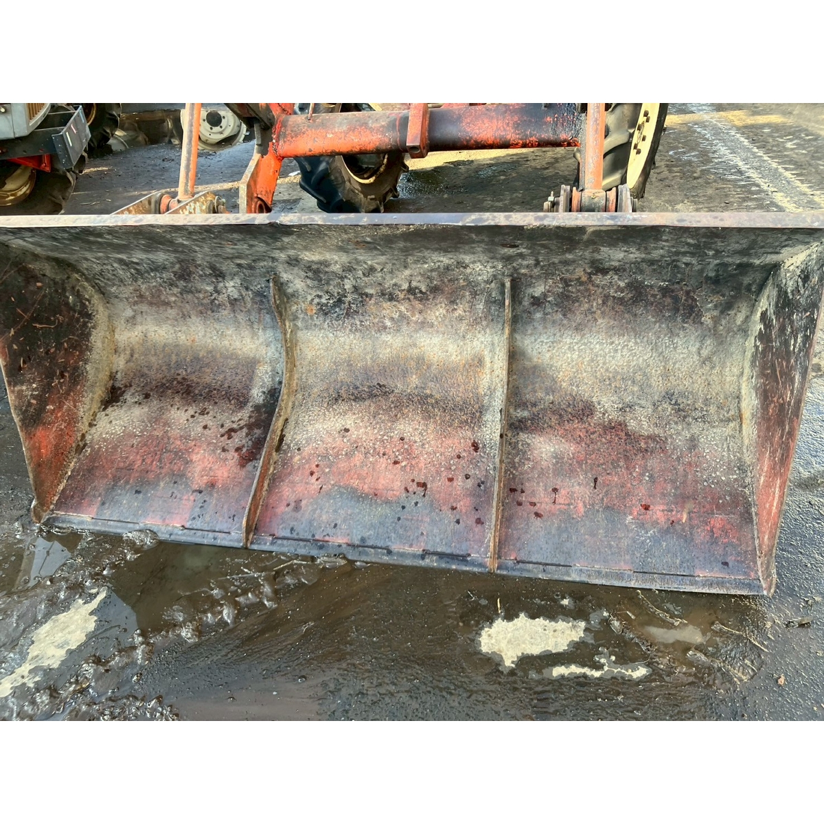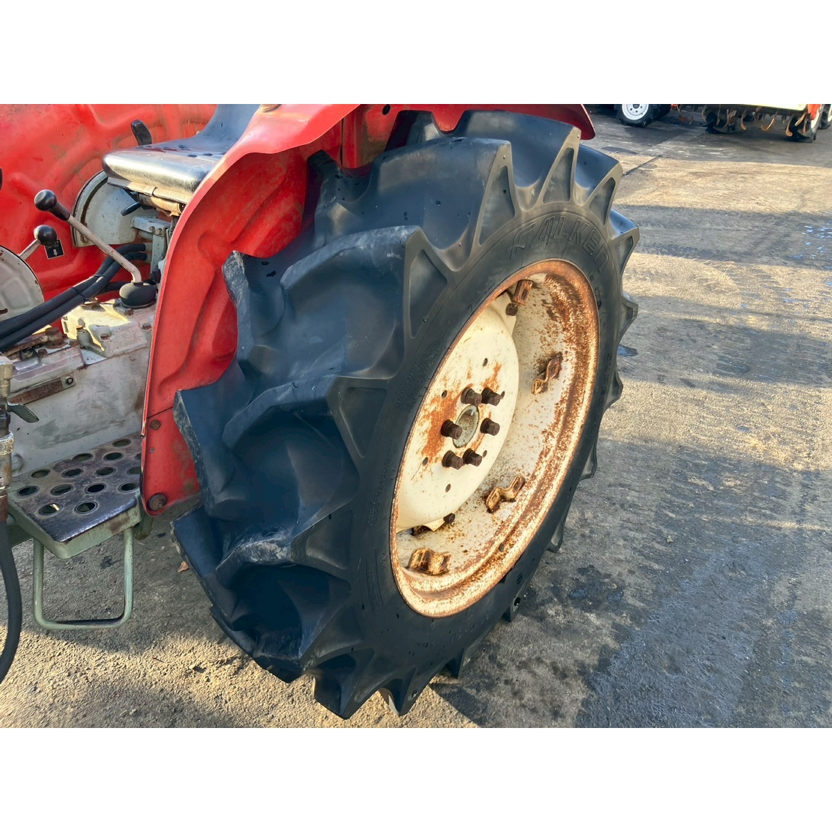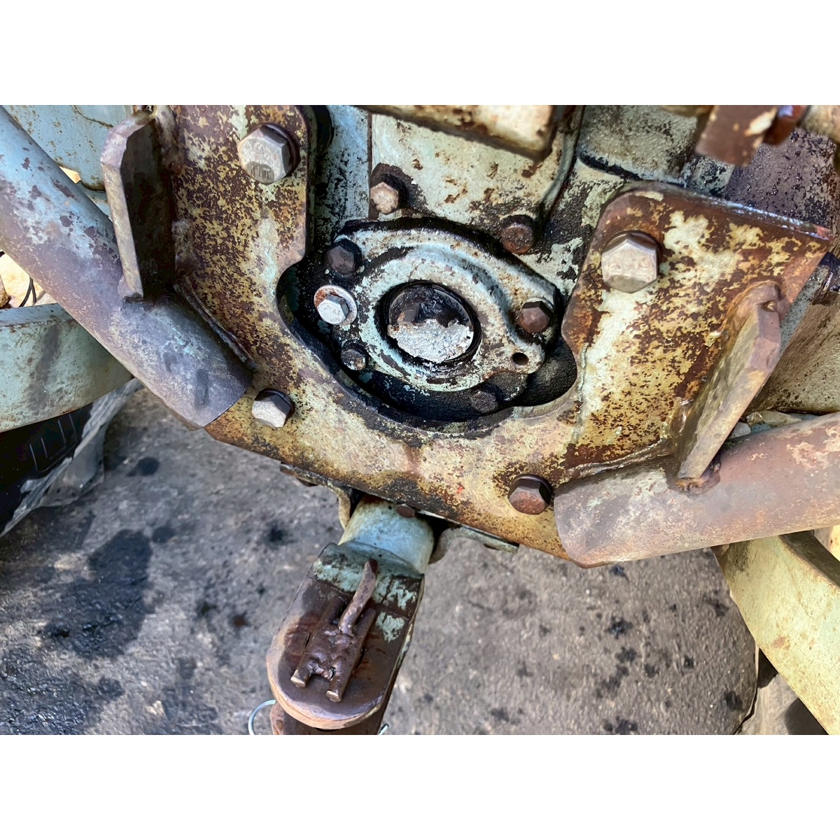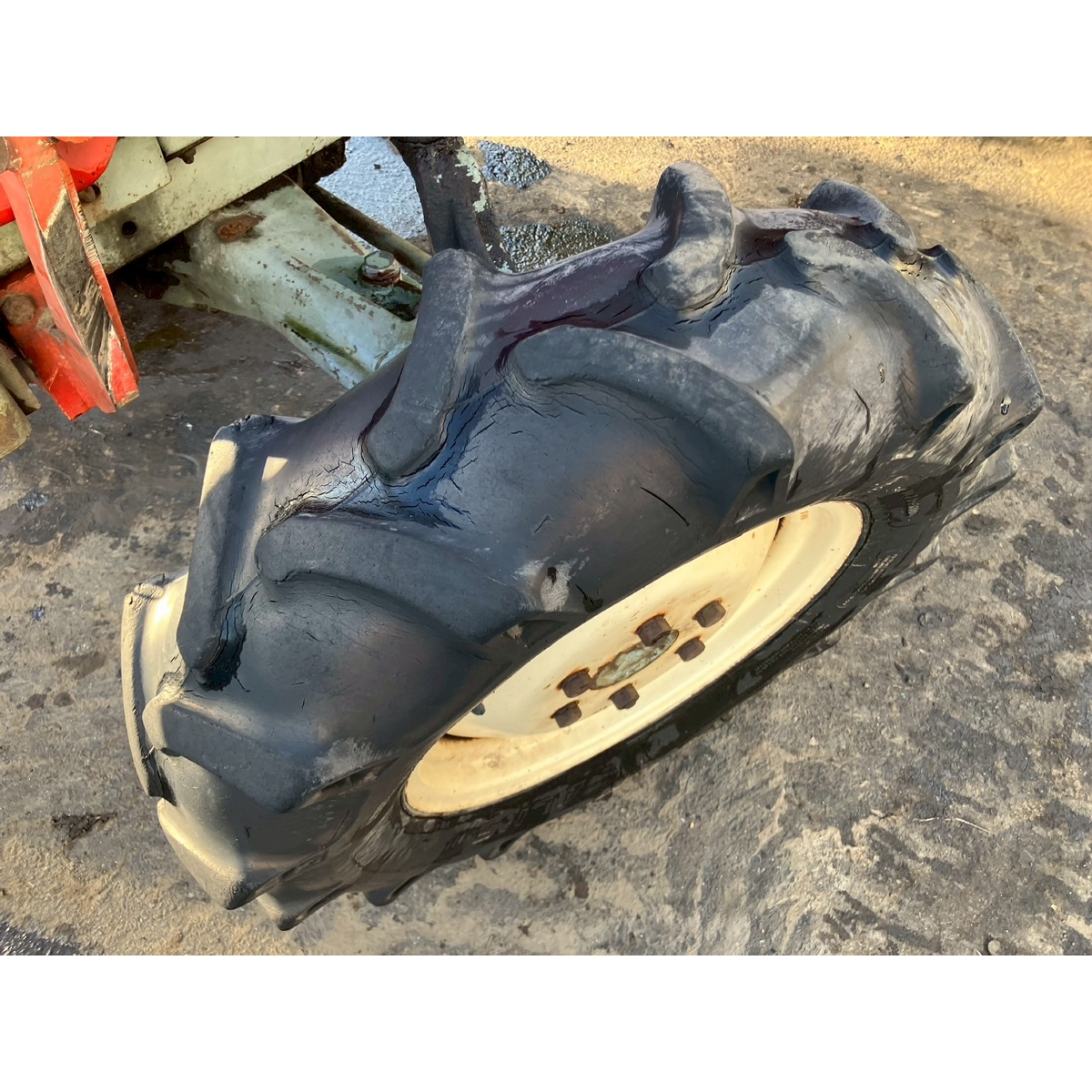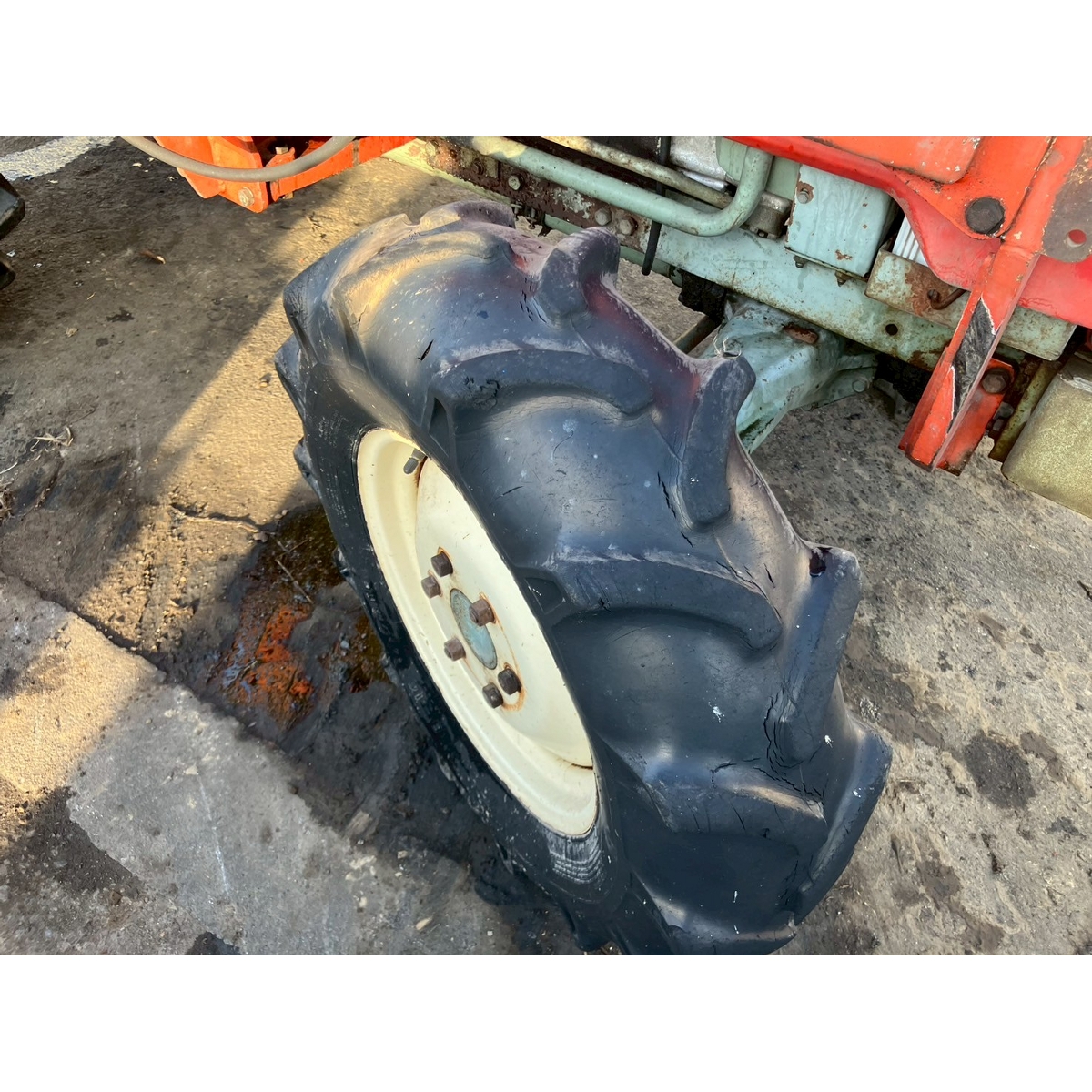 - with rotary, weak battery, with PS, cracked front tires, rear tires in good condition, with front loader and bucket, broken PTO shaft and front left bearing, slightly oil leak from bottom part of tractor, oil leak from front left tire's shaft, tires could blow off during traveling