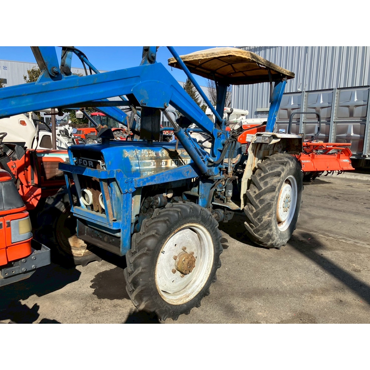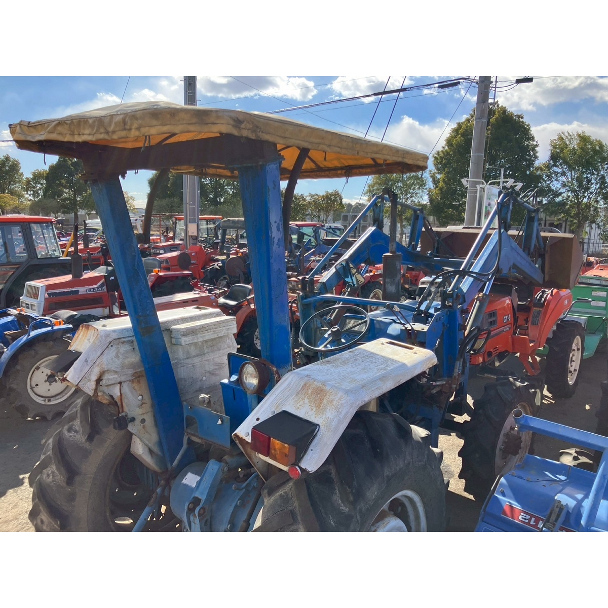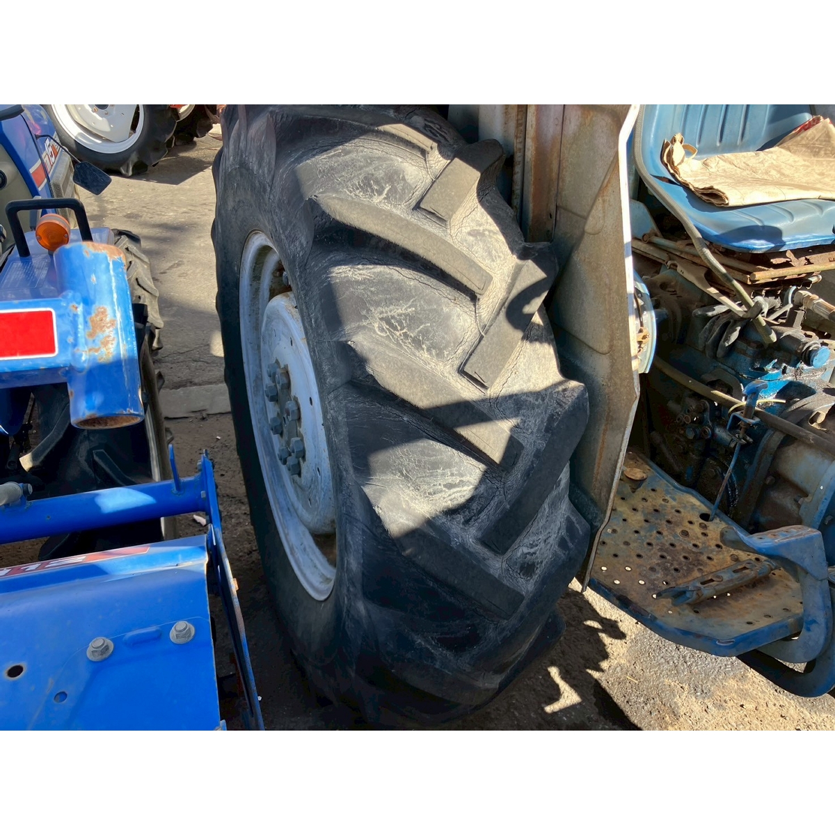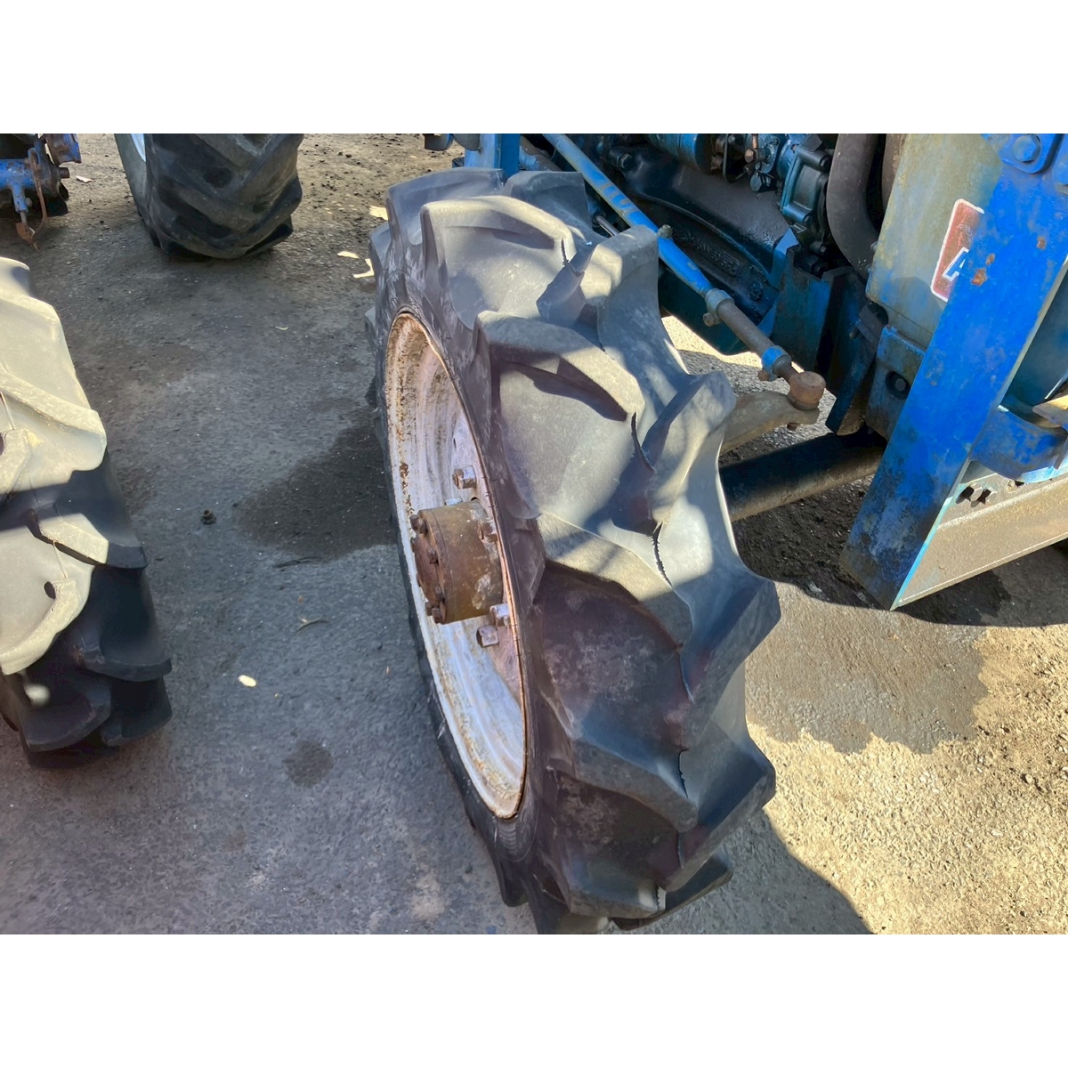 - no rotary, with ps, crack tires, with loader, corrosion/rust mask ,torn seat , repainted fuel leak in engine area, white smoke upon engine start, subsides once engine warms up