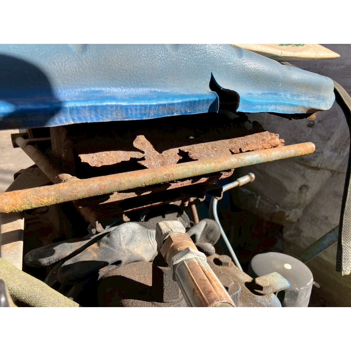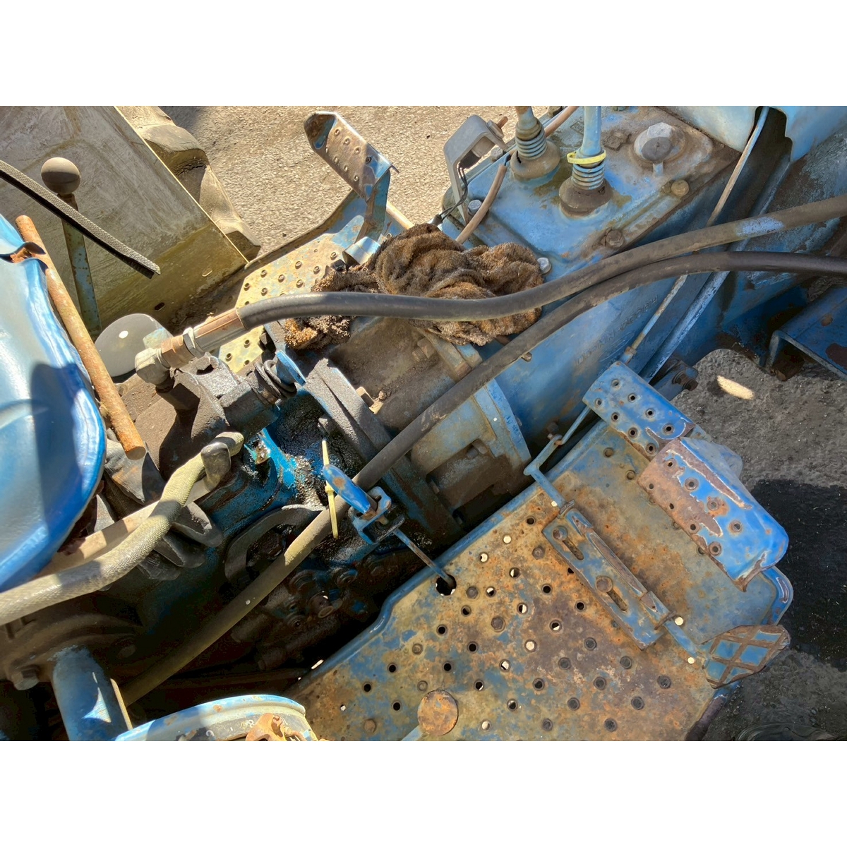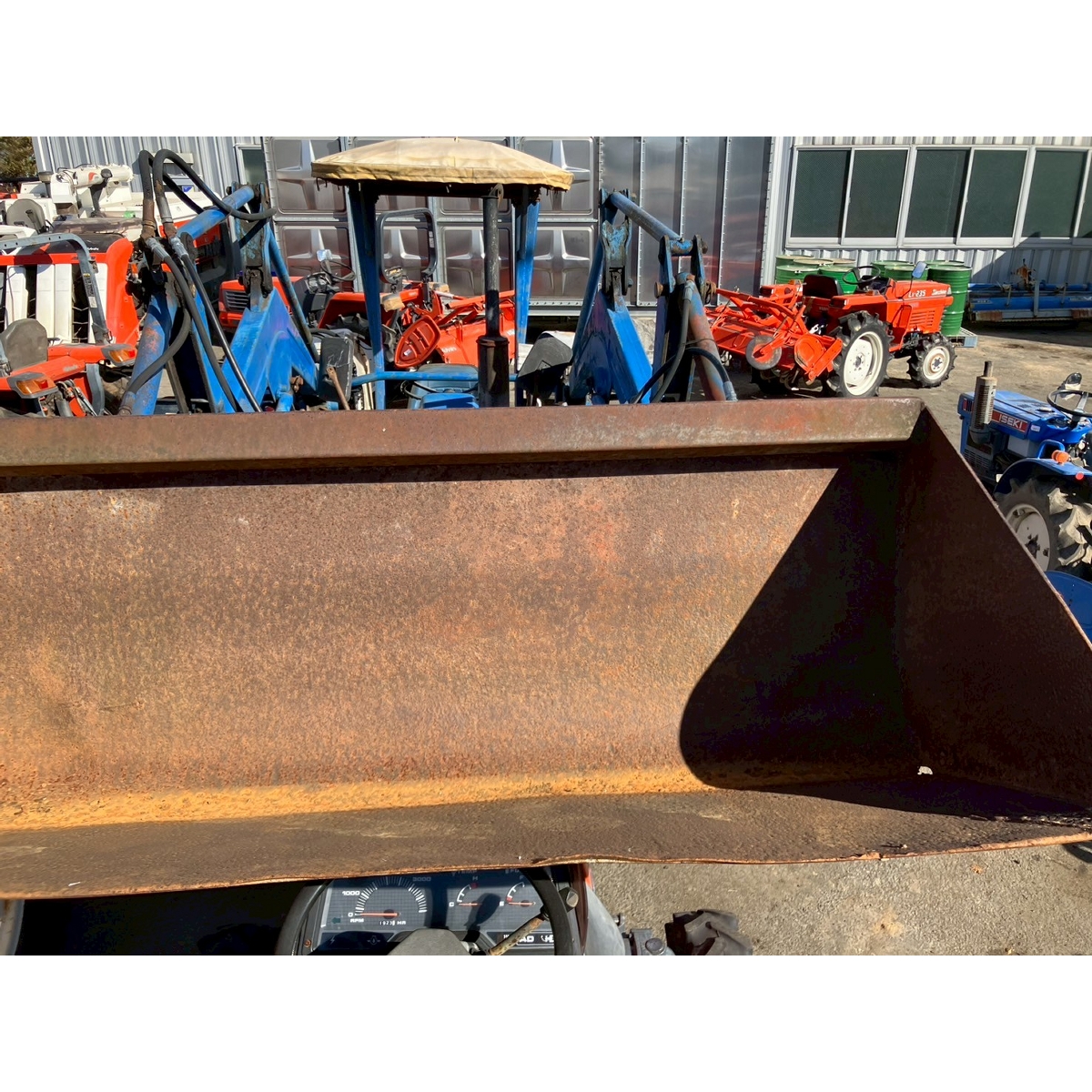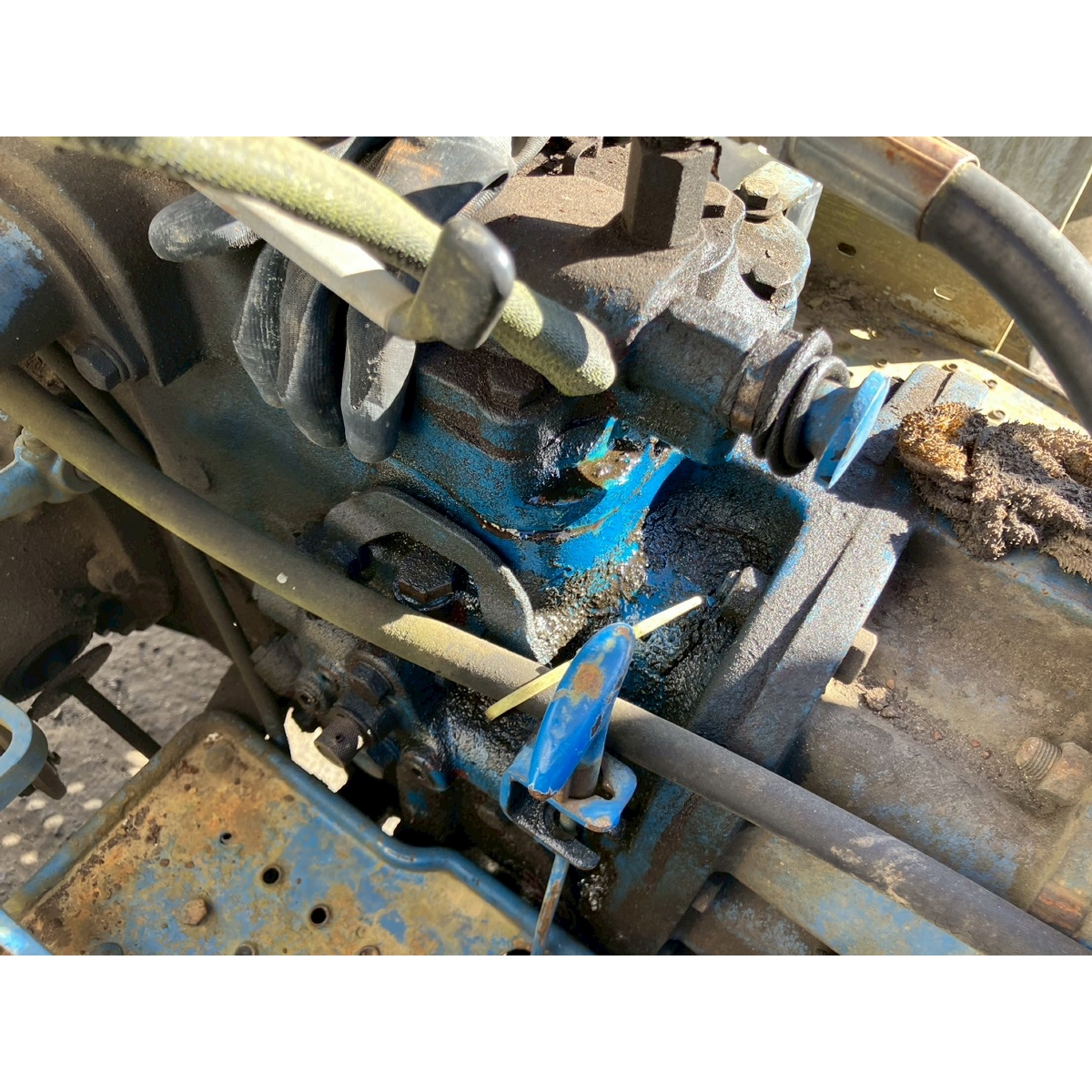 - no rotary, with ps, crack tires, with loader, corrosion/rust mask ,torn seat , repainted fuel leak in engine area, white smoke upon engine start, subsides once engine warms up