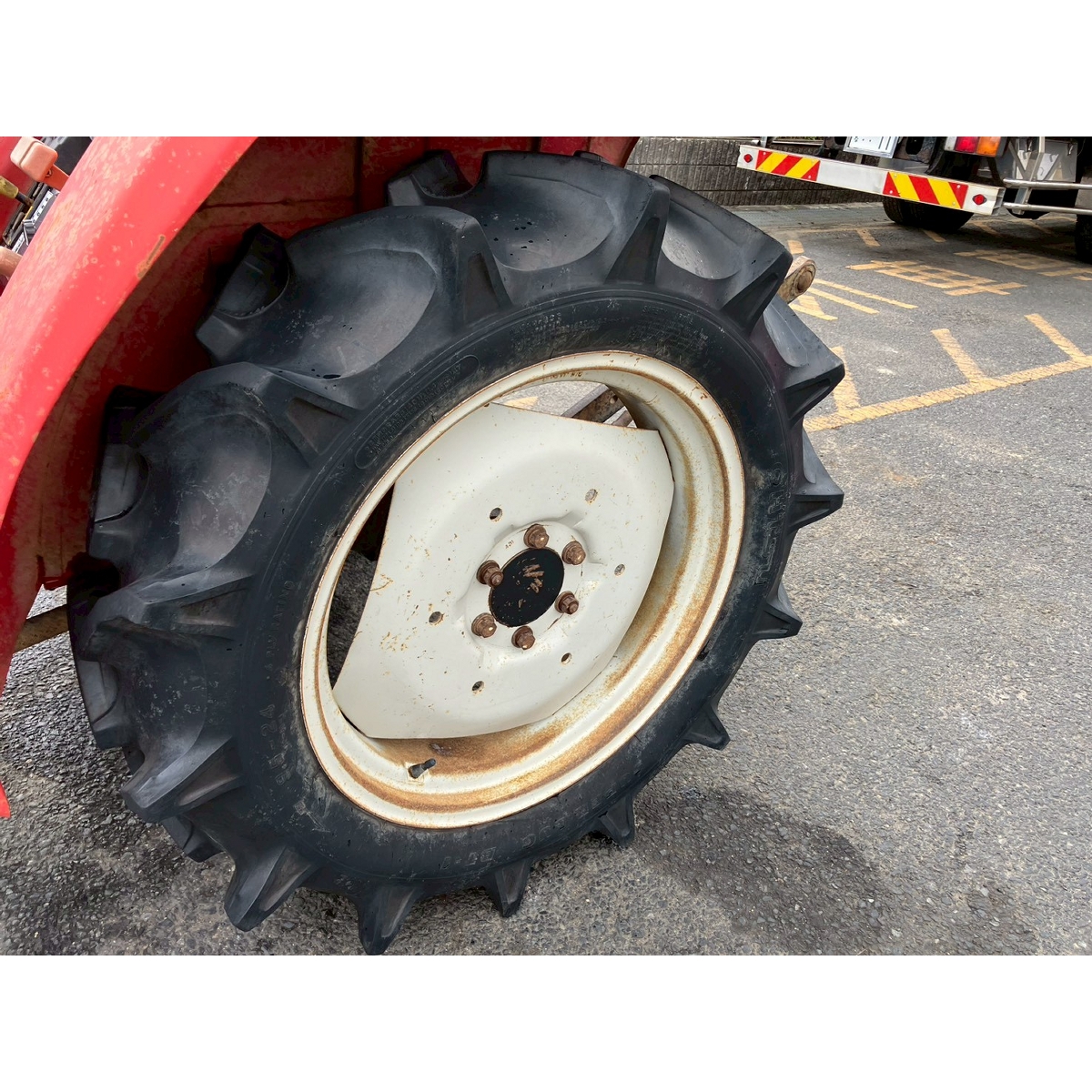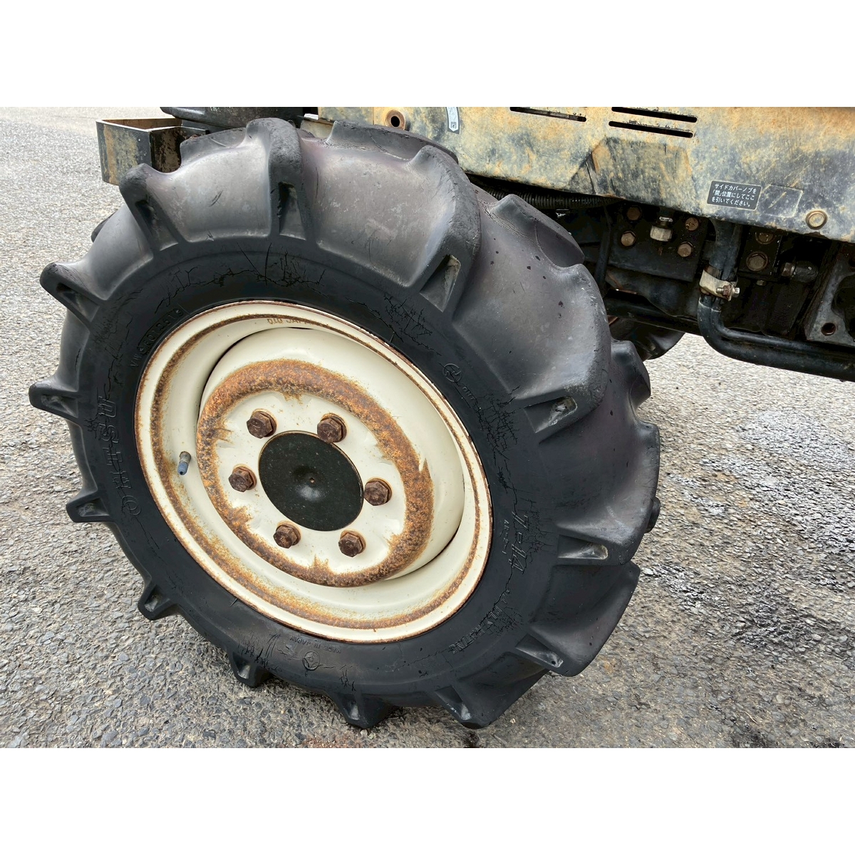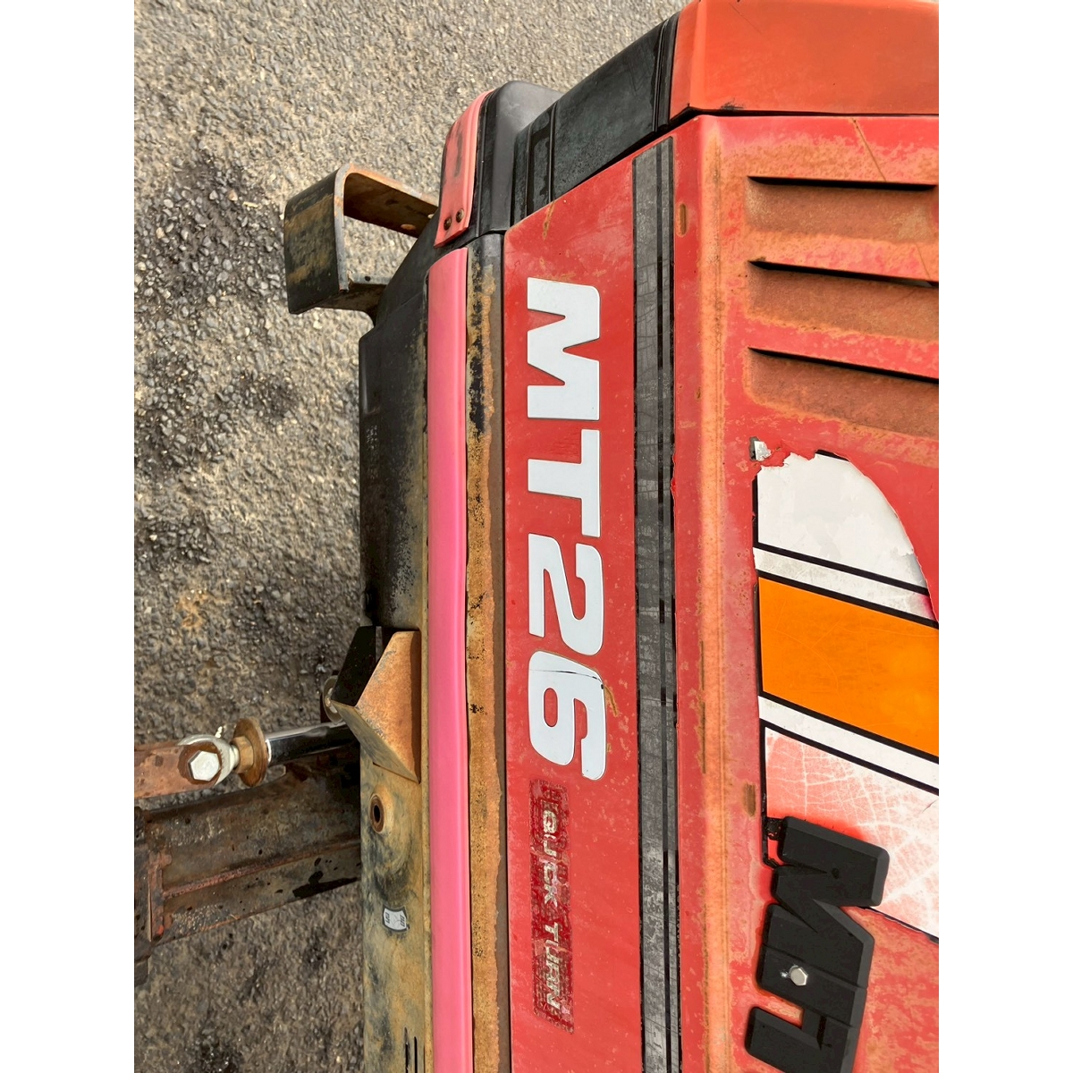 - without rotary, battery ok, with PS, rusty and faded exterior, torn seat, cracked tires, missing top link and joint, One of side cover is different (Mitsubishi tractor: MT26's side cover is on)