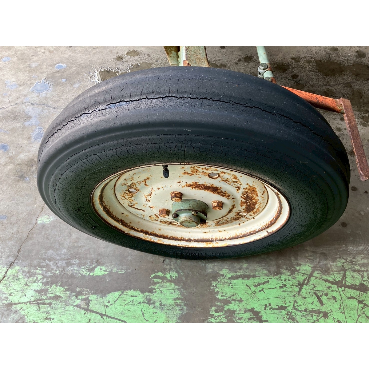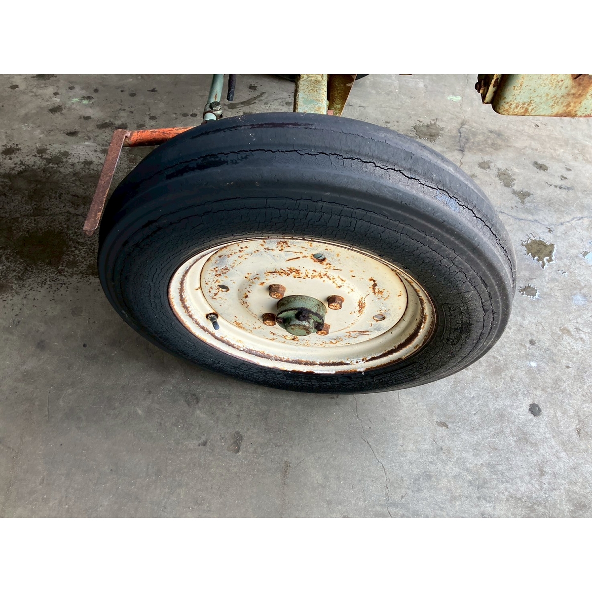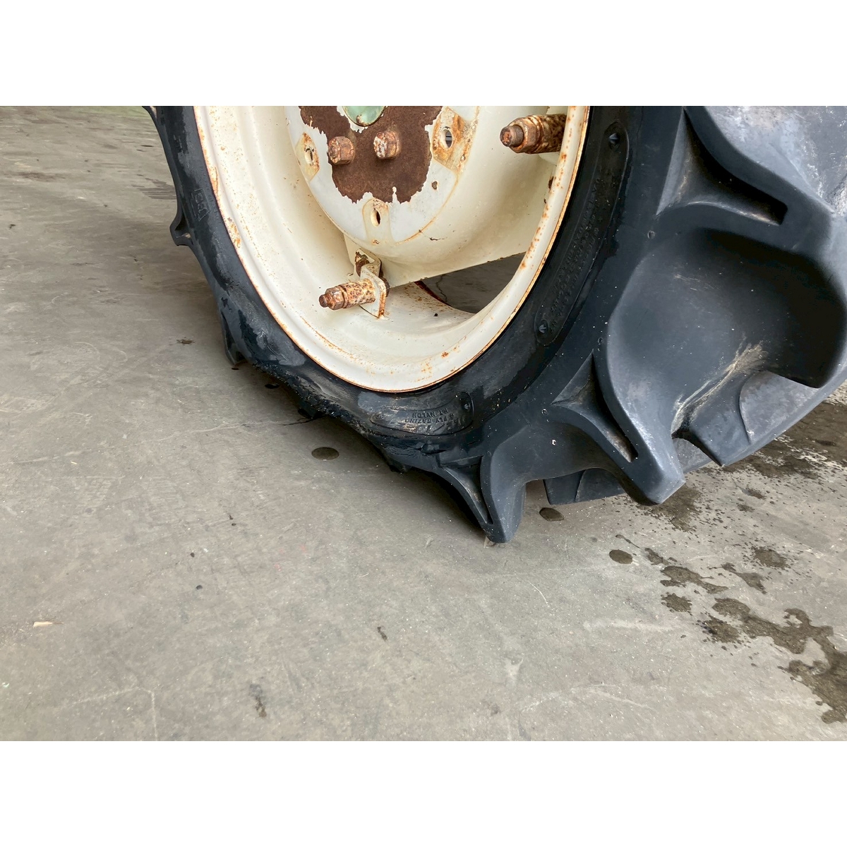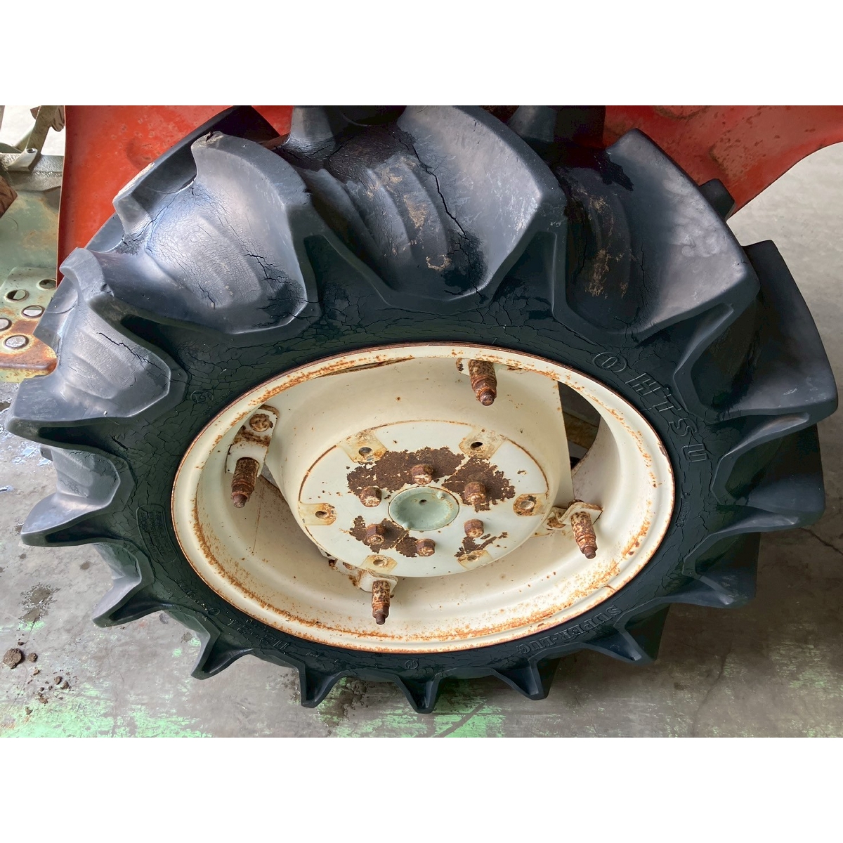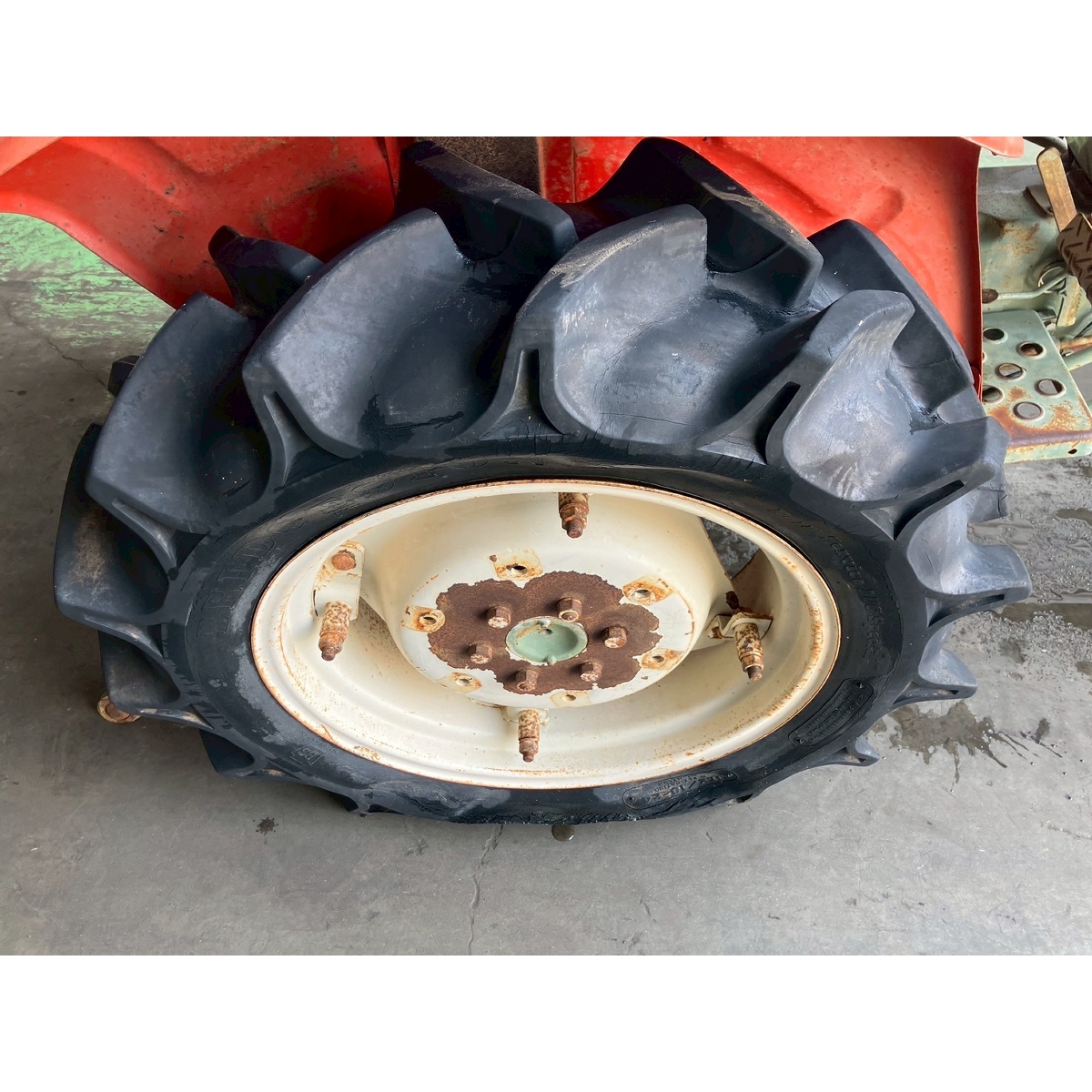 - without rotary, battery ok, without PS, cracked all tires, rear right tire is flat, oil is seeping from bottom part of tractor