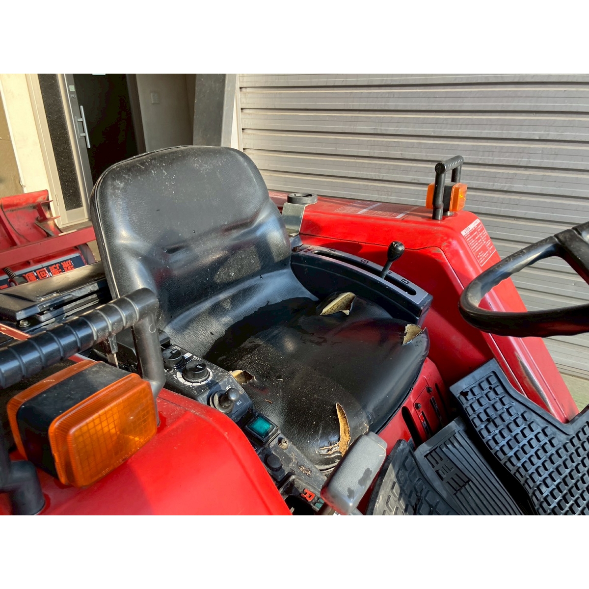 - with rotary, battery ok, with PS, worn all tires, cracked rear tires, oil is seeping from bottom part of tractor, with canopy