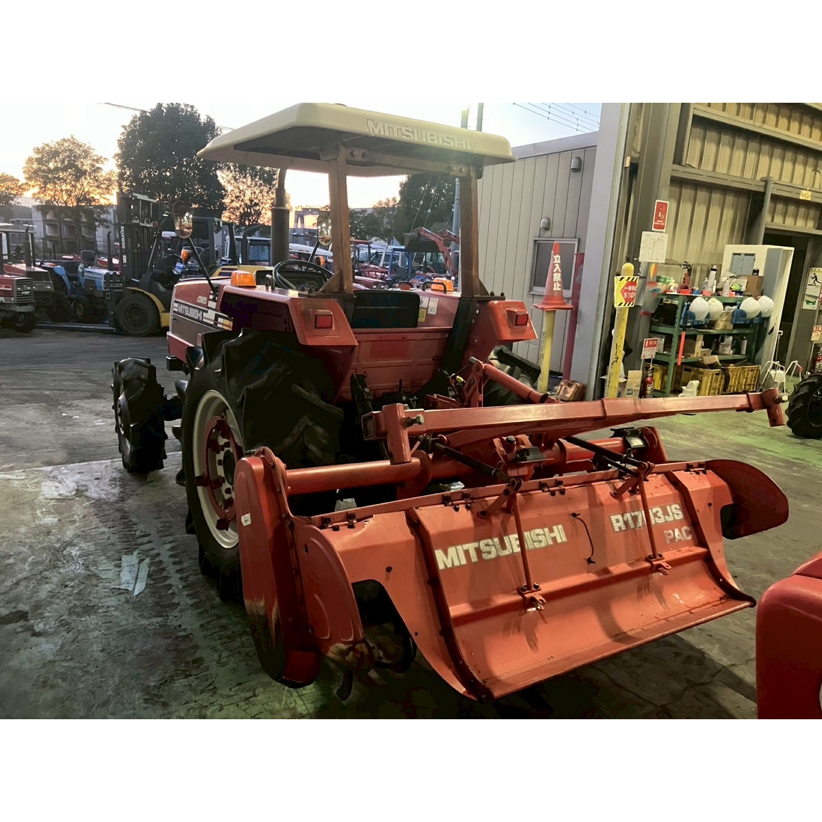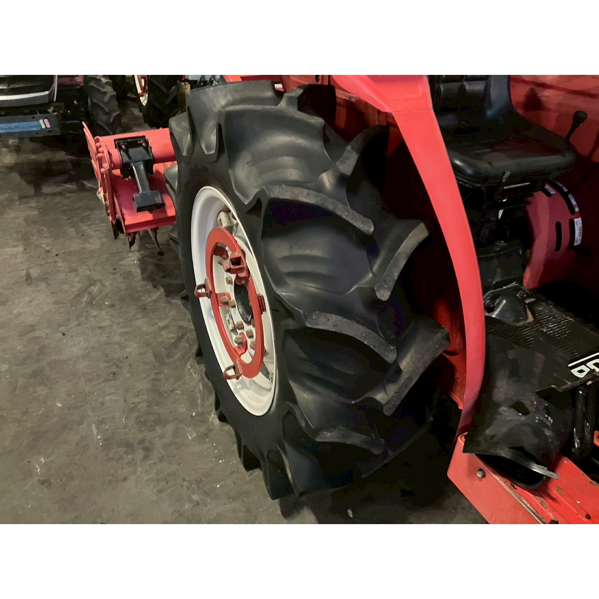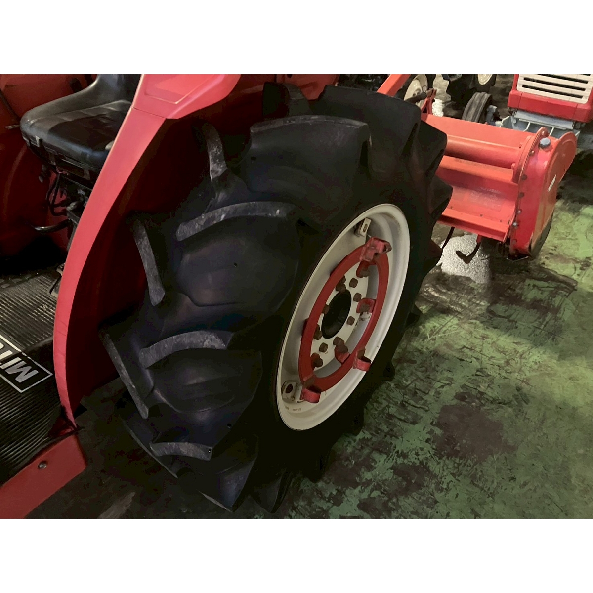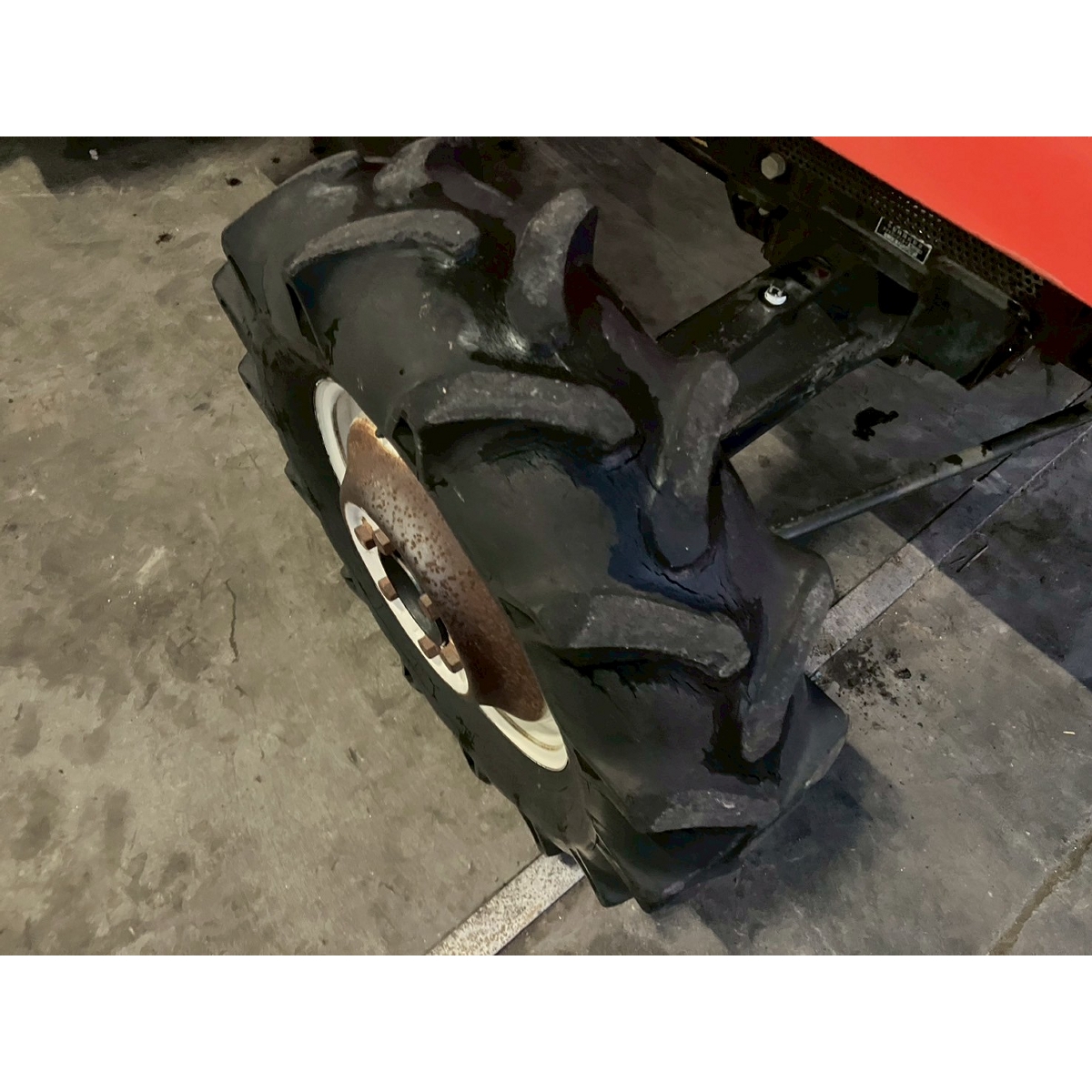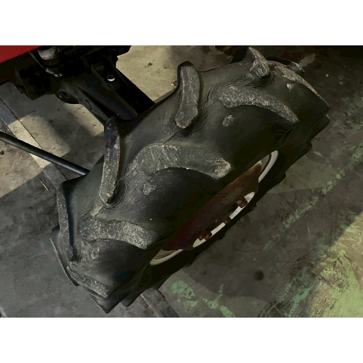 - with rotary, no battery, with PS, worn all tires, cracked rear tire, oil stain around bottom part of tractor, with canopy